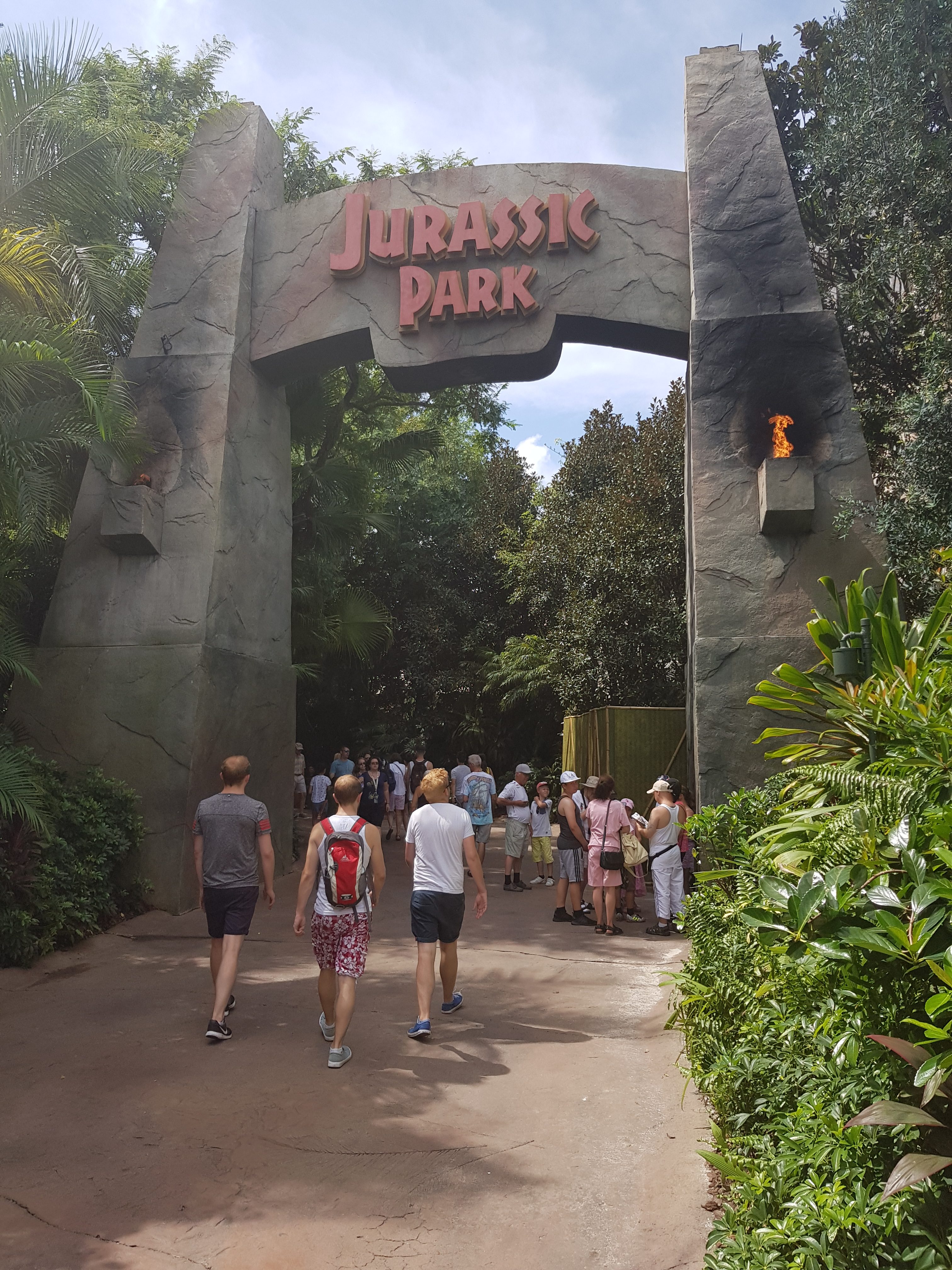 Ein weiteres Thema im Island of Adventure war Jurassic Park. Auch hier gibt es Achterbahnen, ruhige Fahrten, aber auch eine Wasserbahn. Diese suggeriert einen echten Besuch im Jurassic Park. Man fährt gemütlich durch das Tor, sieht Pflanzenfresser an Bäumen nagen, einige Wasserdinos bespritzen uns mit Wasser aus der Nase. Dann macht das Boot allerdings eine Biegung und man hört Hilfeschreie aus einem Funkgerät. Das Raptorengehäge ist beschädigt. Man fährt ziemlich weit hoch in ein dunkles Gebäude. Am Ende wartet der T-Rex auf uns. Er bewegt seinen Kopf auf uns zu und wir stürzen 70 Meter in die Tiefe. Eine entsprechende Dusche gab es natürlich auch.