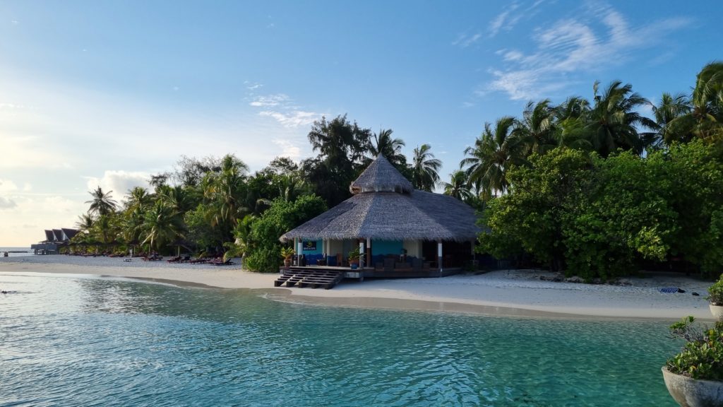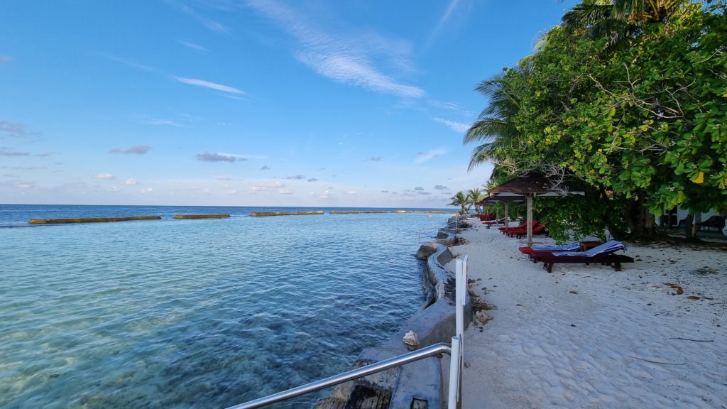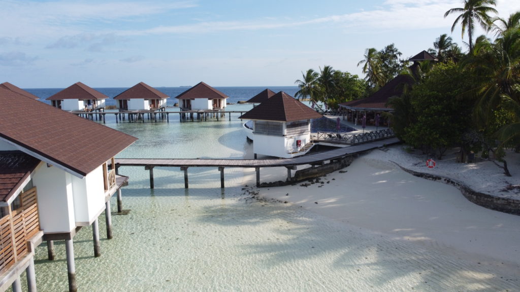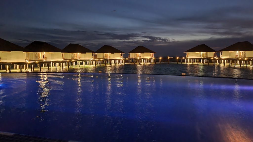 Ich habe auch ein paar Fotos von Wasservillen gemacht. Wir haben uns bei der Buchung bewusst gegen die Wasservillen entschieden und sind auch jetzt noch davon überzeugt, dass es die richtige Entscheidung war. Die Wasservillen haben keinen direkten Zugang zum Meer und es gibt auch keine Liegen am Strand für die Gäste in den Wasservillen. Diese sollen die Liegen auf ihrer Terrasse nutzen. Man muss dann immer ganz außen herum laufen, wenn man ins Meer will. Der Pool ist zwar sehr nah, dennoch gibt es auch am Pool nicht genug Liegen für alle Villenmieter.