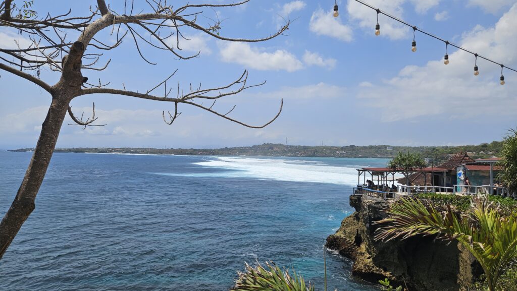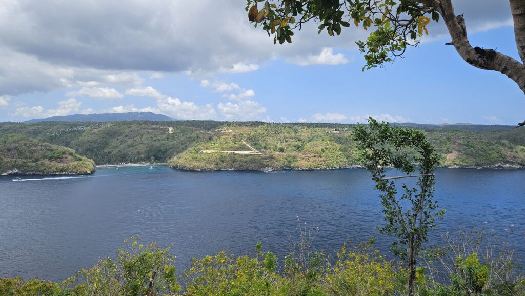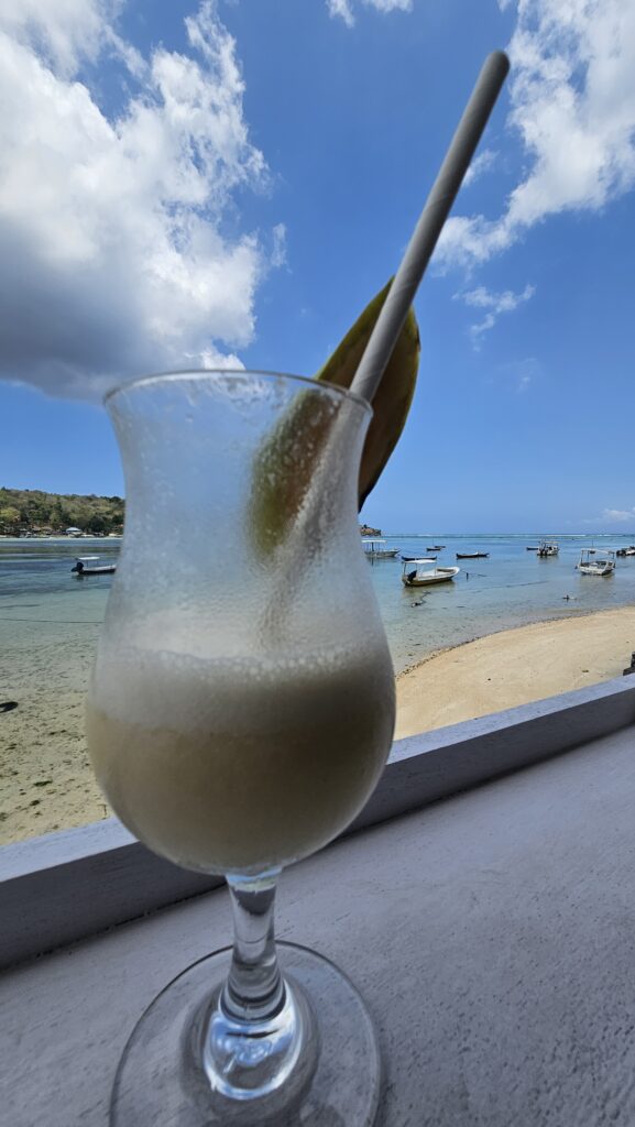 Der erste Stopp war zielstrebig eine Bar am Strand mit Blick auf die Bucht in der wir erst einmal gemütlich angekommen sind und alkoholfreie Cocktails getrunken haben. Weiter ging es dann über die baufällige gelbe Brücke auf die Insel Ceningan, die wir mit dem Roller einmal komplett umrundet haben.