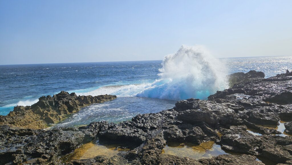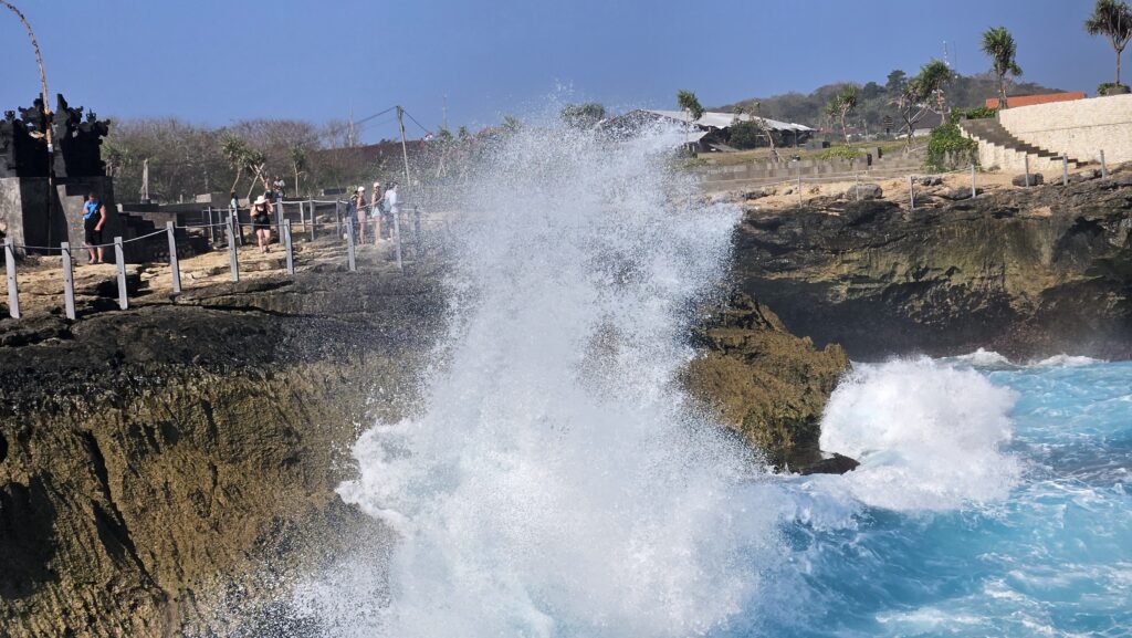 Auf Nusa Lembongan haben wir uns dann noch Devil‘s Tears angeschaut. Eine Bucht, in der die Wellen ziemlich hart auflaufen und an der Brandung extrem hoch spritzen. Hier ist auch zur Sicherheit einiges abgesperrt. Dort sind wohl auch schon unachtsame Touristen ums Leben gekommen.